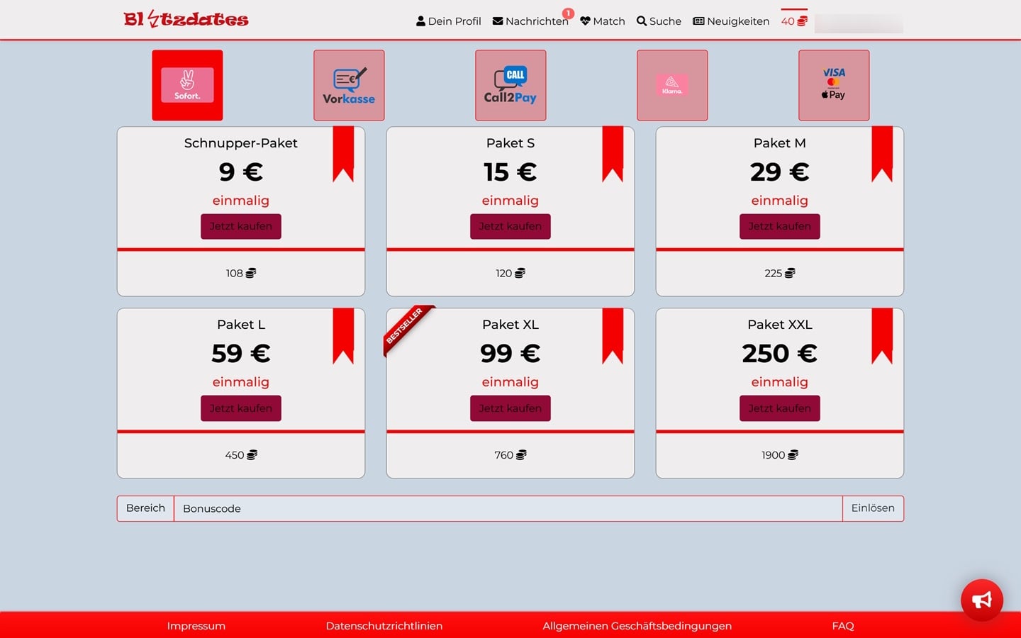 Die Registrierung auf BlitzDates.de ist kostenlos. Nachfolgend fallen aber Gebühren für die Nutzung an. Das Portal bietet kein Abonnement für eine Premium-Mitgliedschaft an. Es fallen aber sehr hohe Kosten für Credits an. Das Versenden einer Nachricht kostet 12 Credits. Aufgrund der Anmeldung erhalten neue Nutzer ein Gratis-Guthaben von 40 Credits. Das reicht für drei Nachrichten aus. Dann müssen neue Credits gekauft werden. Die Credits werden in insgesamt sechs verschiedenen Paketen zum Kauf angeboten. Das kleinste Paket enthält 108 Credits und kostet 9,00 Euro. Damit kann man neun Nachrichten versenden.