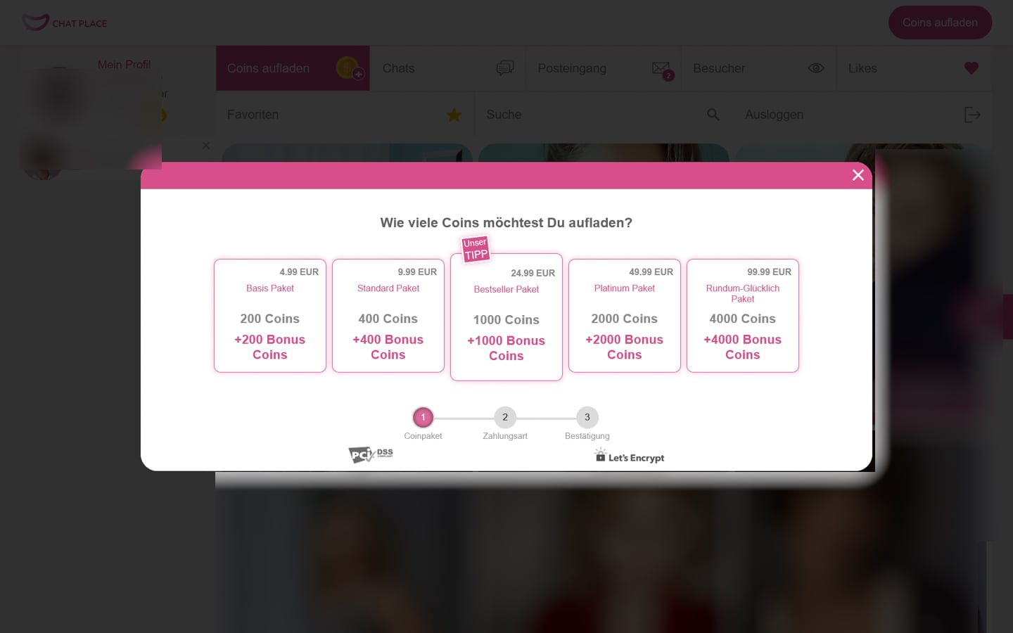 ChatPlace.com arbeitet ausschließlich mit Coins-Paketen. Das Einstiegsangebot umfasst 200 Coins + 200 Bonus-Coins für 4,99 EUR, gefolgt von 400 Coins + 400 Bonus für 9,99 EUR. Wer intensiver chatten möchte, kann 1 000 Coins + 1 000 Bonus für 24,99 EUR kaufen. Die Pakete mit 2 000 Coins + 2 000 Bonus kosten 49,99 EUR, und das größte Paket mit 4 000 Coins + 4 000 Bonus schlägt mit 99,99 EUR zu Buche.