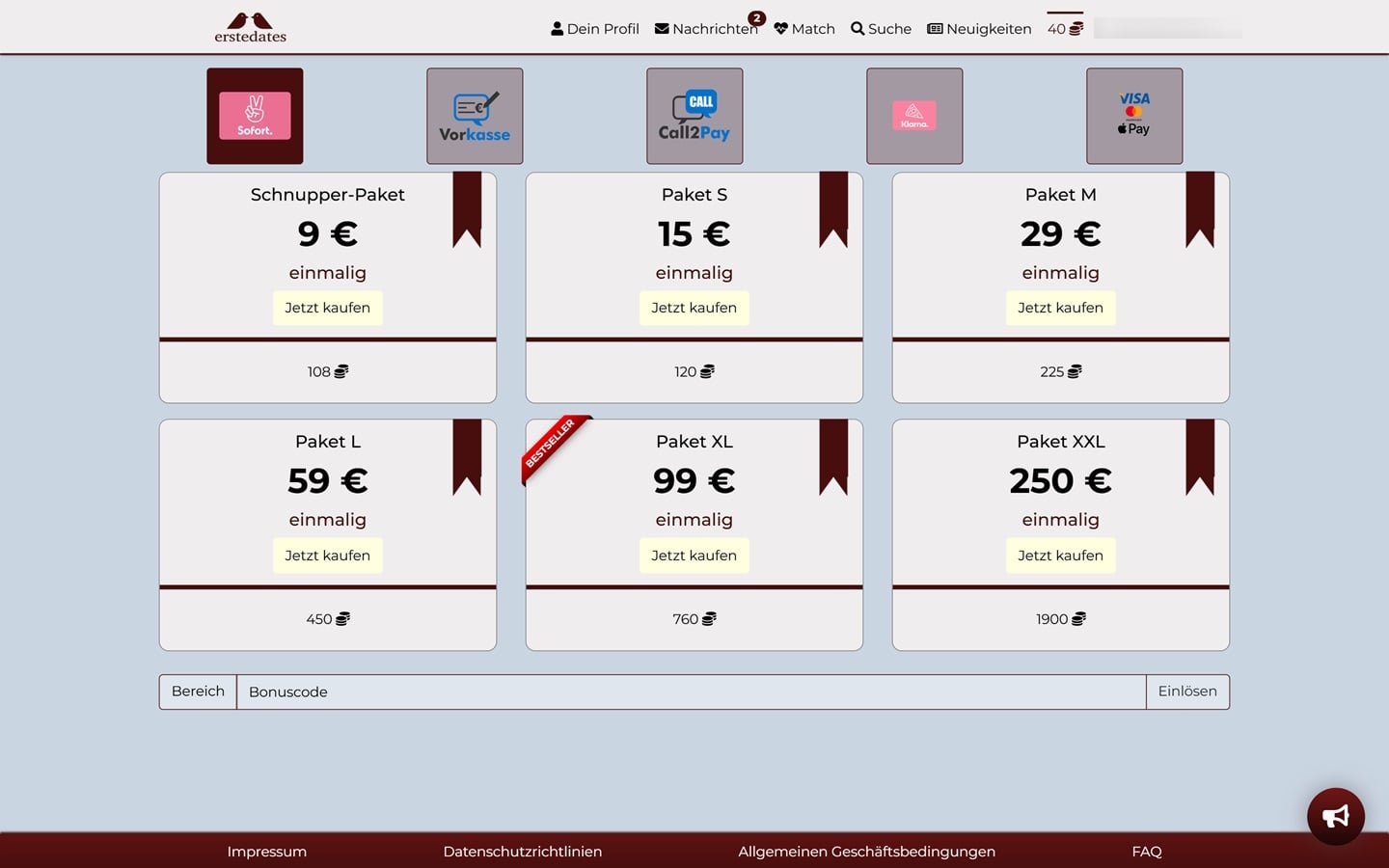 Die Registrierung auf ErsteDates.de ist kostenlos, nachfolgend fallen Kosten für das Versenden von Nachrichten an. Es gibt kein Abonnement für eine Premium-Mitgliedschaft, demnach kann eine Abofalle ausgeschlossen werden. Es handelt sich dennoch um eine Abzocke durch einen moderierten Chat. Unseren Erfahrungen nach besteht keine Chance auf ein Date, da die meisten Profile der Webseite rein fiktiv sind.