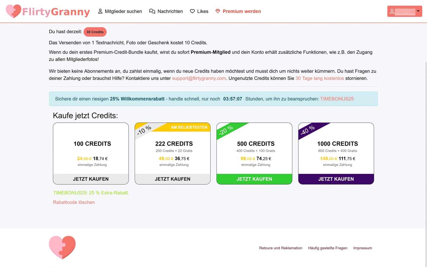 Eine transparente Übersicht, welche weiteren Aktionen Credits verbrauchen, fehlt. Wichtig: Verbleibende Credits werden bei Kündigung nicht erstattet. Da die Plattform früh Nachrichten anstößt, entsteht leicht eine Nachkauf-Spirale mit schwer kalkulierbaren Gesamtkosten. Unserer Erfahrung nach eine reine Abzocke von unwissenden Usern.