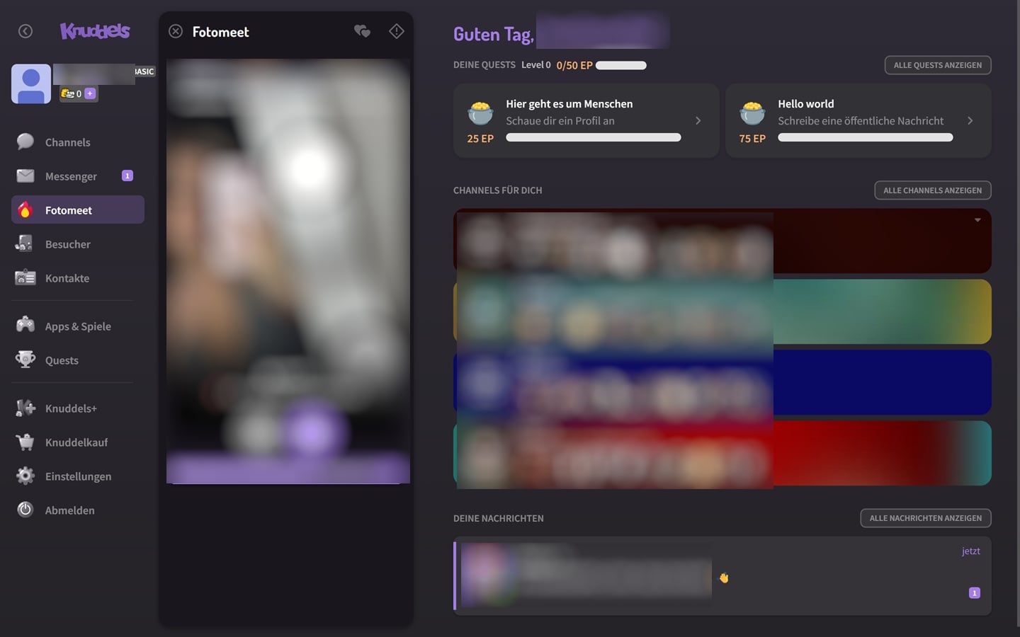 Man erhält einen PIN per SMS, um das Profil auf Knuddels.de zu verifizieren, dann wird man auf die Webseite weitergeleitet. Das Portal hat ein solides Design mit einer recht guten Übersicht. Zu Beginn wirkt die Webseite trotzdem etwas überladen, da es viele verschiedene Bereiche mit vielen verschiedenen Funktionen gibt. Es gibt etwa die Funktion Fotomeet, bei der man ein Foto sieht. Liken zwei User gegenseitig das jeweils andere Profilbild, kommt es zu einem Match und man kann zum Chatten beginnen.