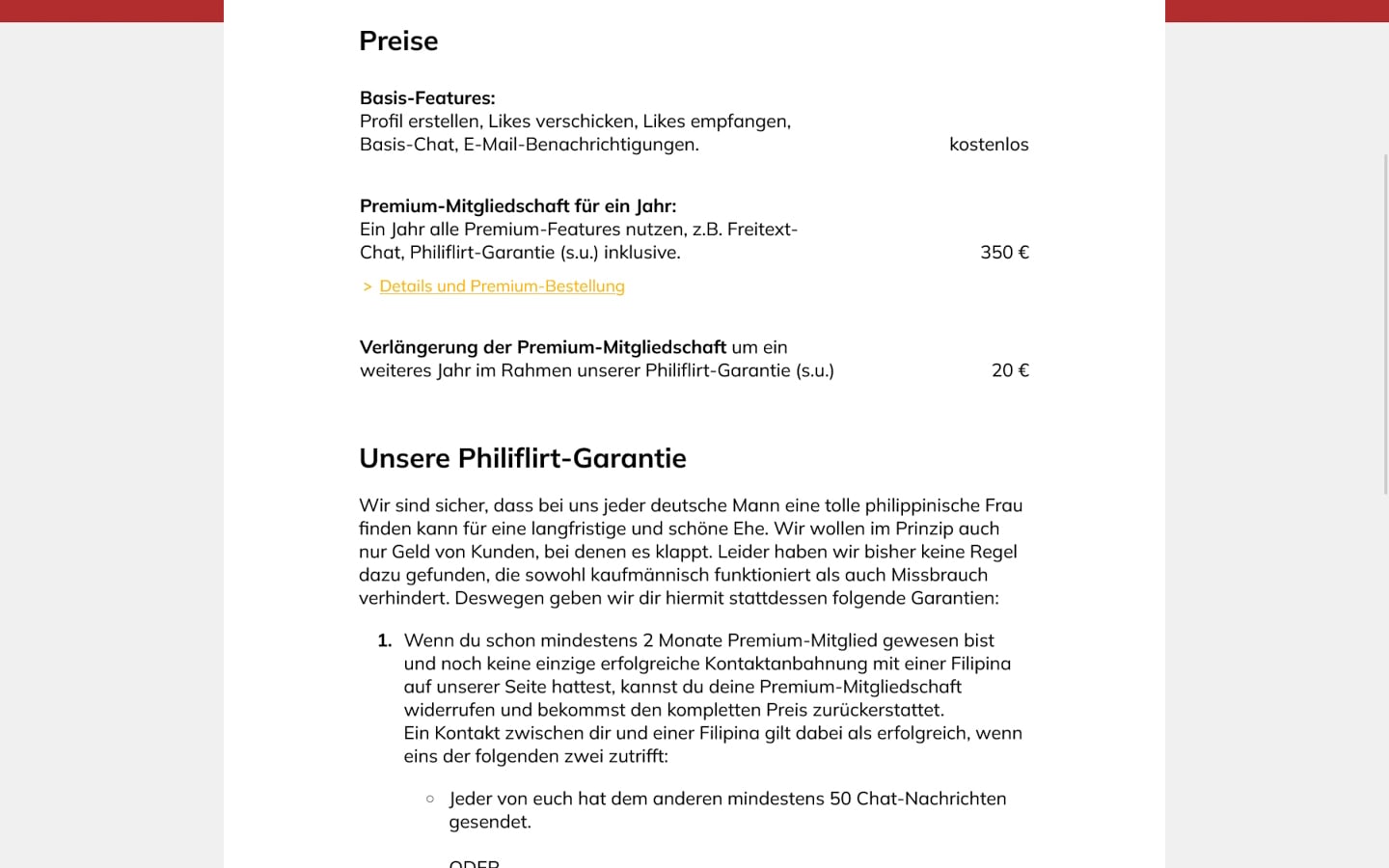 Positiv: Die PhiliFlirt-Garantie verspricht nach zwei Monaten Premium-Mitgliedschaft unter bestimmten Bedingungen Geld zurück. Negativ: Die Auswahl auf deutschsprachige Männer beschränkt, das Starten-Chatguthaben fehlt, und Profile auf der Startseite werfen Datenschutzfragen auf. 1 Jahr Premium kostet 350 €, die Verlängerung ein weiteres Jahr pauschal 20 €. Insgesamt bietet PhiliFlirt.com eine seriöse Nische mit klaren Konditionen und Geld-Zurück-Option, ist aber nicht für alle Nutzer-Typen geeignet.