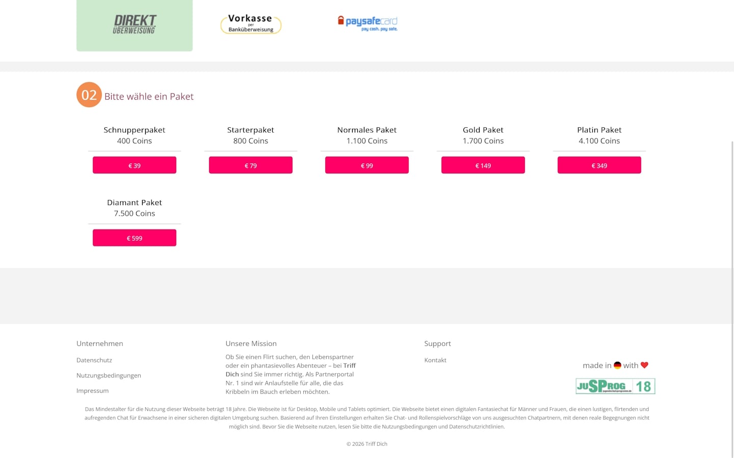 TriffDich.com nutzt ein Coin-System. Eine Nachricht kostet 15 Coins, zum Start gibt es 30 Coins, was gerade einmal für zwei Nachrichten reicht. Danach wird ein Kauf nötig, um überhaupt weiter kommunizieren zu können. Die Preise sind hoch gestaffelt: 400 Coins für 39 €, 800 für 79 €, 1100 für 99 €, 1700 für 149 €, 4100 für 349 € und 7500 für 599 €. Je länger man schreibt, desto schneller steigt der Gesamtbetrag – gerade weil jede einzelne Nachricht separat abgerechnet wird.