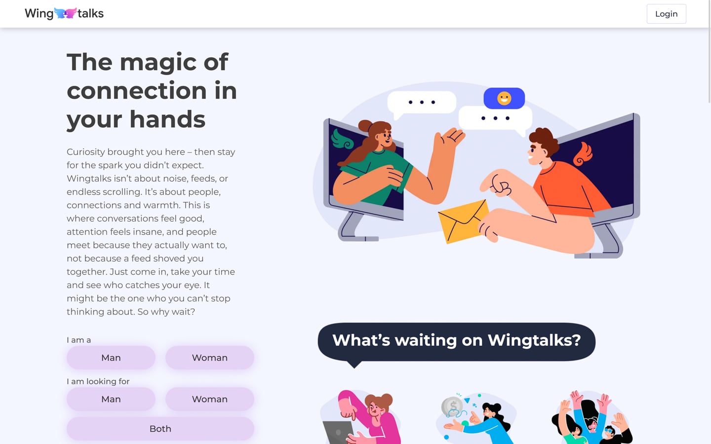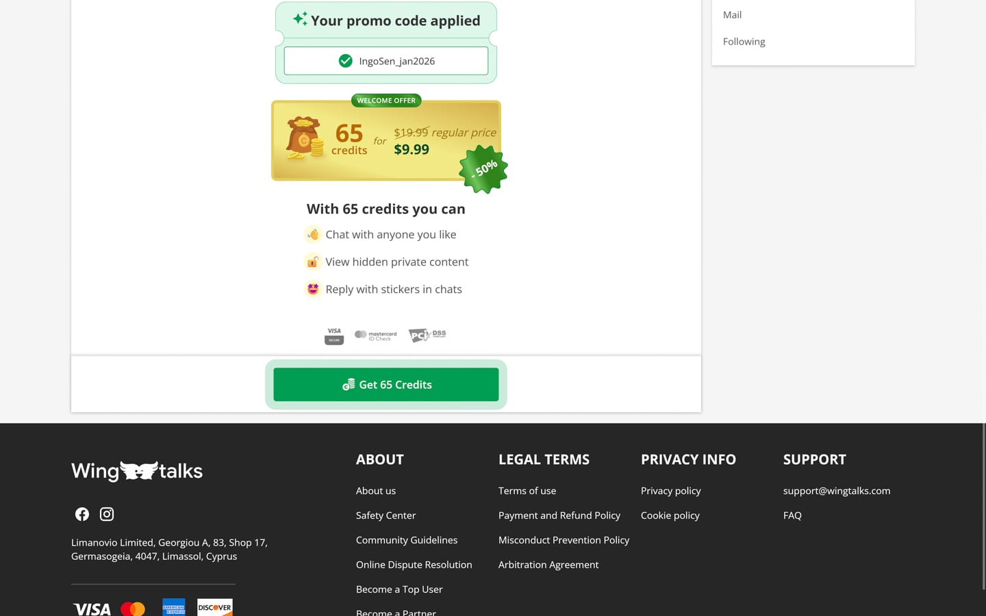 WingTalks.com sperrt zentrale Funktionen hinter Credits. Viele Aktionen kosten extra (Chat-Minuten, Sticker, Medien). Direkt nach der Anmeldung treffen sofort Nachrichten ein; das Profil wird laut Hinweis breit geteilt und der Versand automatisierter Nachrichten ist zu akzeptieren – das erzeugt Aktivität, die schnell Credits verbrennt. In den Regeln steht wörtlich: „The use of the Website’s paid features is possible by spending the virtual ‘Credits’“ sowie „To facilitate the interaction… „We allow to send the same messages (‘Icebreakers’).“ und „It is not allowed to share personal data on any public page of the Website.“